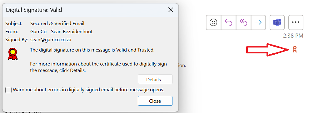 Your recipient will see your email has been signed with a Digital Signature.